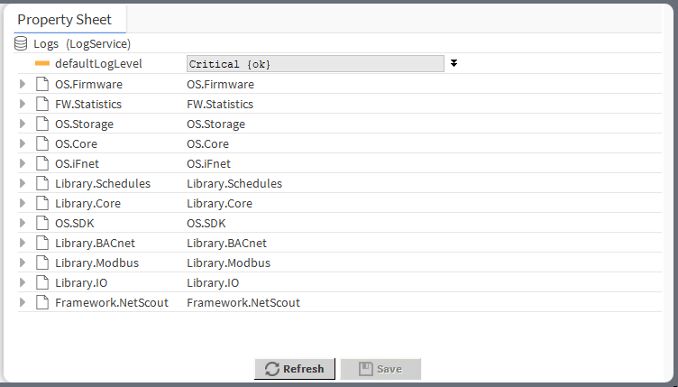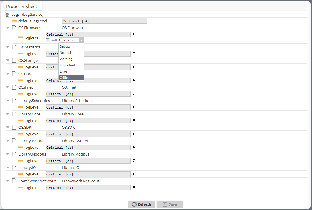 The records in the Logs register are grouped by their genre; they are categorized depending on the area they originated–firmware, core, BACnet, app, etc. Each group may have its individual log level defining priorities of data to be recorded, according to the users needs. These priorities are differentiated from Debug (each event happening is registered) to Critical (only few events that result in the system error are registered).