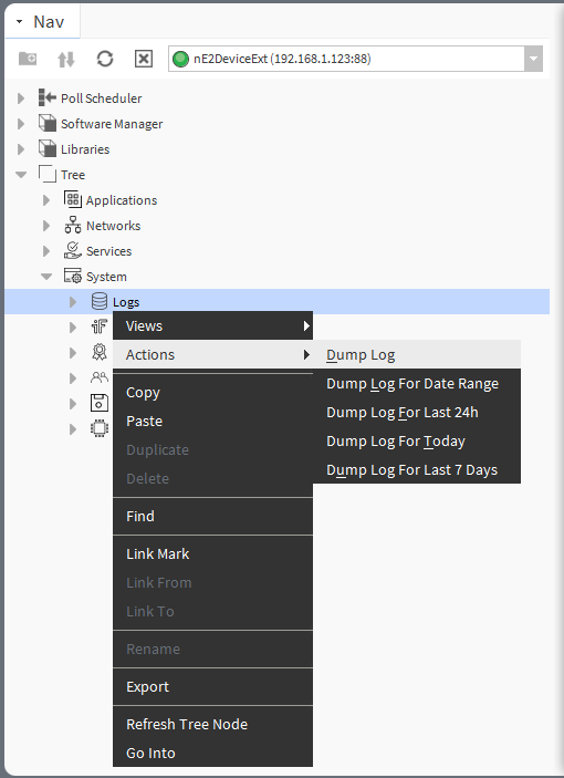 To save logs, right-click on Logs and select Actions → Dump Log from the context menu.