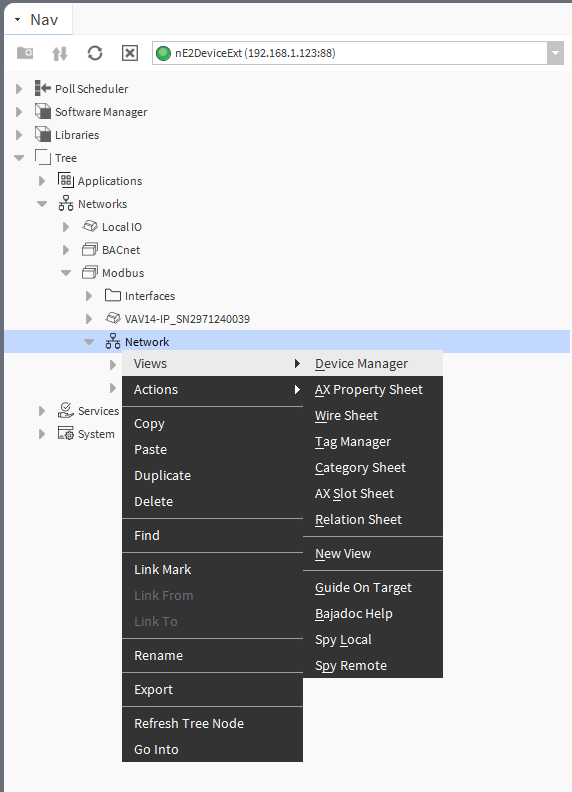 The Modbus Device Manager view is accessible from the context menu of the Modbus Network component. It is also automatically opened if the Modbus Network component is double-clicked in the nav tree window.