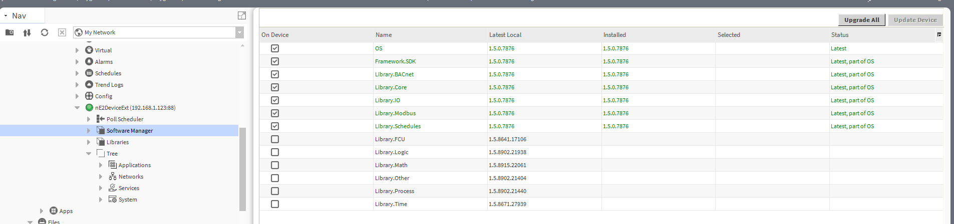 The Software Manager is synchronized with the Workbench or the Niagara controller shared folder of the station. By default, the Software Manager displays the default nano EDGE ENGINE libraries supported by the version of the module. All third party libraries must be added to the shared folder.