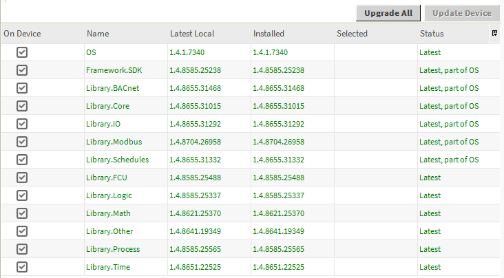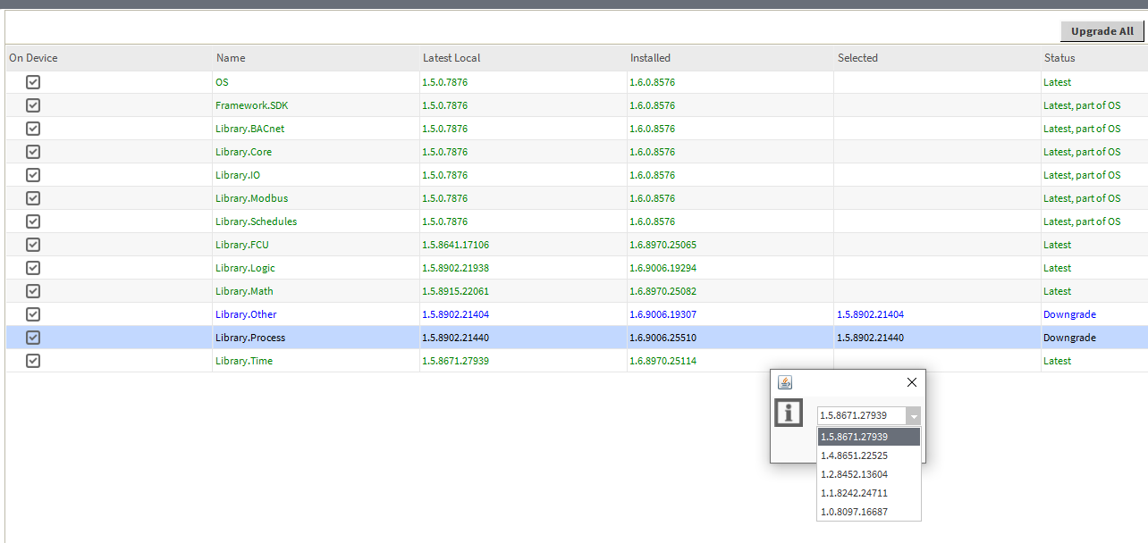 Unless the user intends to manually select the versions to be installed, there is also the option to automatically select all newest versions for all out of date elements using the Upgrade All button.