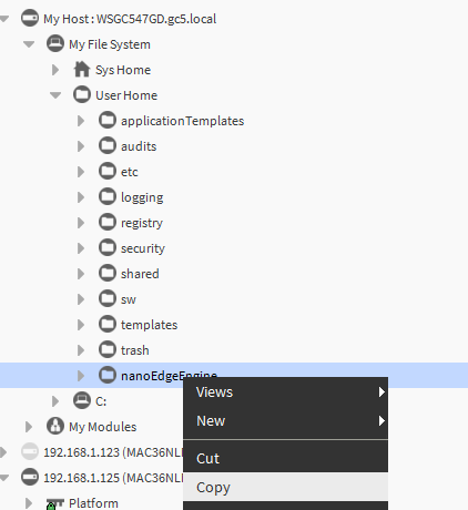 copy the proper nano EDGE ENGINE libraries and/or OS files from the local PC by navigating to the proper location on My Host (local PC); (it is possible to copy the whole folder with proper contents but please make sure then that the folder is named ‘nanoEdgeEngine’);