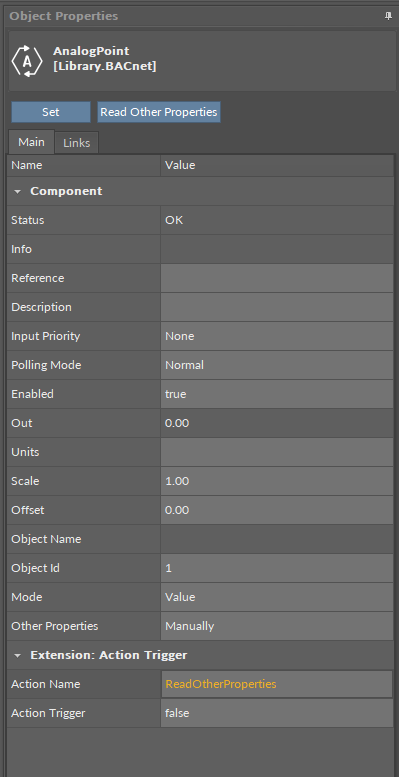 The AnalogPoint component includes an action that allows to set its Out value in case no Data Point class component is linked to it; the value is sent to the BACnet object with no priority.