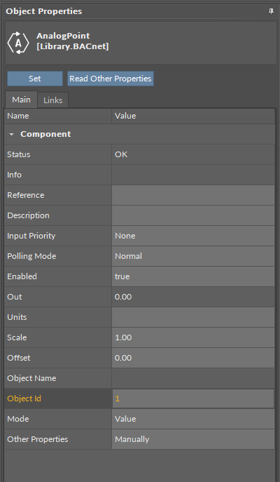 Object Id: allows setting an address of the BACnet object in the remote device; once the component has been added, the slot's default value is null—for the component to operate properly, the unique address value must be set in this slot.