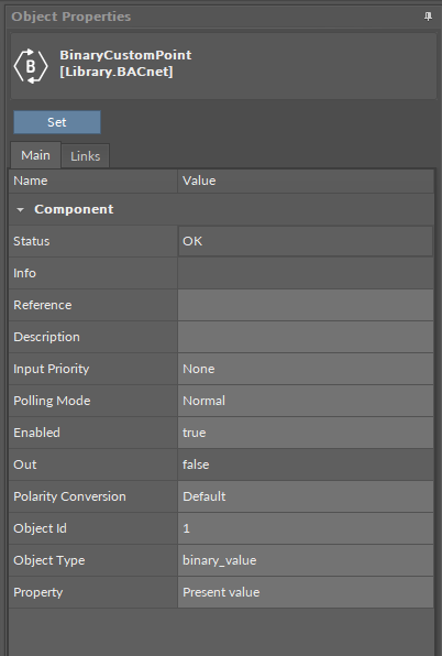 The BinaryCustomPoint component is a network point class component, which allows to read and write binary values to a defined BACnet Binary Value object and property in the remote device.