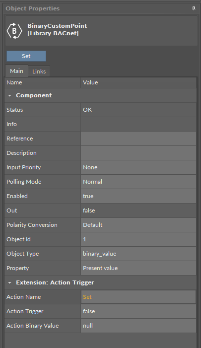 The BinaryCustomPoint component includes an action that allows to set its Out value in case no Data Point class component is linked to it; the value is sent to the BACnet object with no priority.