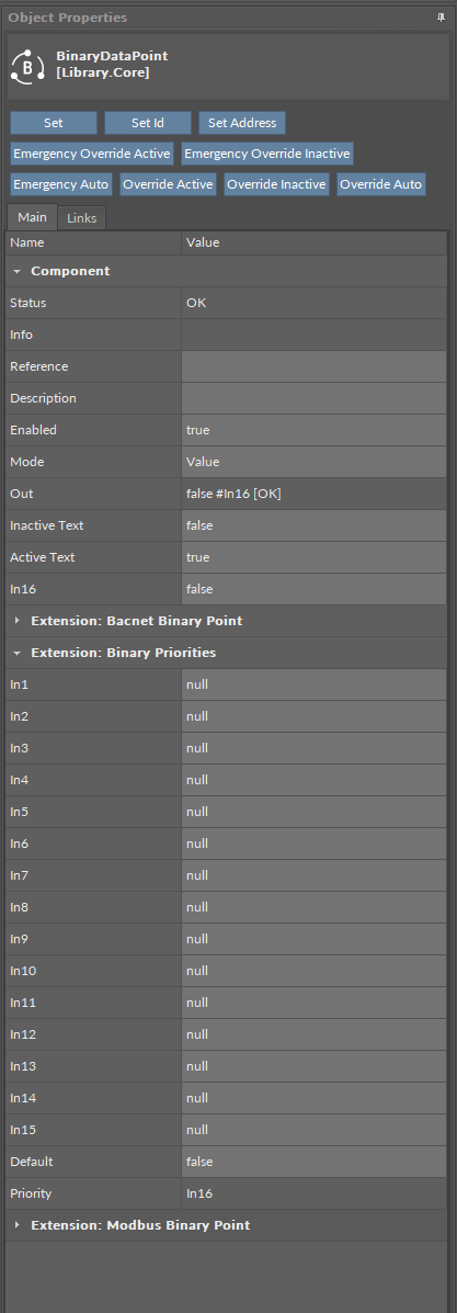 The BinaryPriorites extension adds In1–In15 slots and the Default slot, which is the lowest, 17th priority. The extension also introduces new actions to the Data Point: EmergencyOverride, EmergencyAuto, Override, and OverrideAuto. The BinaryPriorities extension adds fifteen writable input slots and the default priority slot to the BinaryDataPoint. The extension includes also the Priority slot indicating, which slot is transferring value to the Out slot.