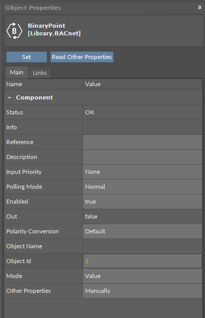 The BinaryPoint component includes an action that allows to set its Out value in case no Data Point class component is linked to it; the value is sent to the BACnet object with no priority.
