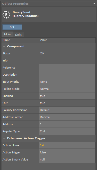 The BinaryPoint component is a network point class component, which allows to read and write Boolean values to a defined Modbus coil in the remote device.