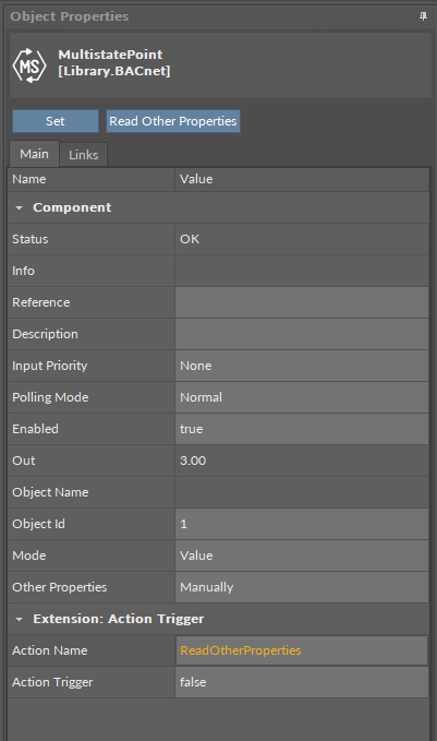 The MultistatePoint component is a network point class component, which allows to read and write analog integer positive values to a defined BACnet object in the remote device.