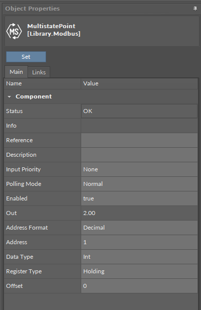 The MultistatePoint component is a network point class component, which allows to read and write analog integer positive values to a defined Modbus register in the remote device.