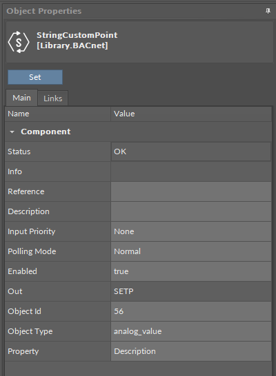 The StringCustomPoint component is a network point class component, which allows to read and write string values to a defined BACnet object and property in the remote device.