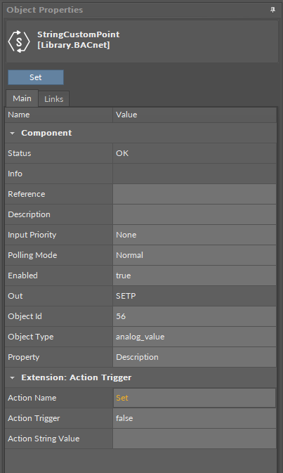 The StringCustomPoint component includes an action that allows to set its Out value in case no Data Point class component is linked to it; the value is sent to the BACnet object with no priority.