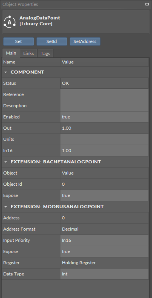 - SetId: sets a BACnet object Id of the Analog Data Point (exposed in the BACnetAnalogPoint extension);