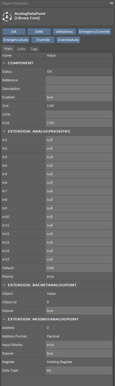 The AnalogPriorities extension adds fifteen writable input slots and the default (lowest) priority slot to the Analog Data Point. The extension includes the Priority slot indicating, which slot is transferring value to the Out slot. The AnalogPriorites extension adds In1–In15 slots and the Default slot, which is the lowest, 17th priority. The extension also introduces new actions to the Data Point: EmergencyOverride, EmergencyAuto, Override, and OverrideAuto.