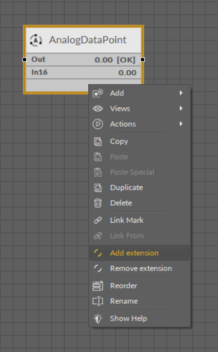 The extended mode of the Analog Data Point is switched on by adding the AnalogPriorites extension to the Analog Data Point component. The extension adds 16 writable input slots to the Data Point. It is added by right-clicking on the Analog Data Point component (either in the Wire Sheet or Property Sheet view).