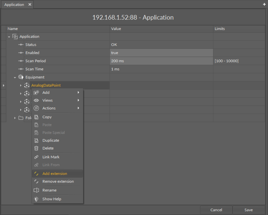 Data Points can have their functionality modified by extensions. The Analog Data Point is originally equipped with the BACnetAnalogPoint and ModbusAnalogPoint extensions (these cannot be added or removed), but other extensions, which offer different functionalities, can be added or removed as necessary. Extensions are added by right-clicking the Analog Data Point, either in the Wire Sheet or Property Sheet view, Application Manager, or in the Workspace Tree.