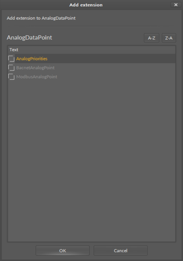 Apart from the BACnetAnalogPoint and ModbusAnalogPoint, it is possible to add the following extensions to the Analog Data Point: