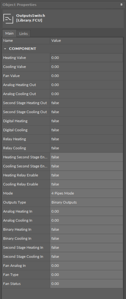The OutputSwitch component allows to manage outputs for the temperature and fan control, according to the FCU configuration (2- or 4-pipe system, analog or binary temperature control, etc.).