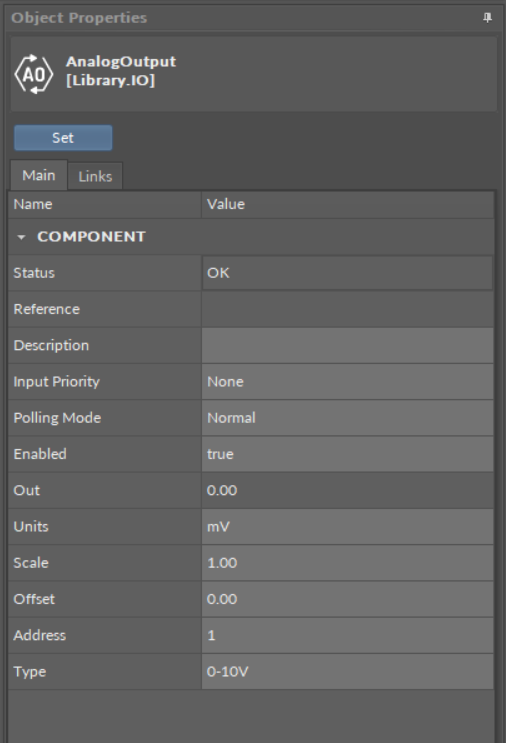 The AnalogOutput component includes an action that allows to set its Out value in case no Data Point class component is linked to it.