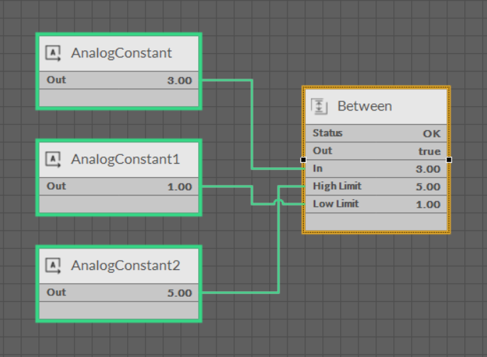 The Between component checks whether the In slot value is within limits set by the Low Limit and High Limit value. The Out slot returns a Boolean value—true if the In slot is within limits, false if the In slot is outside limits. The In, Low Limit, and High Limit slots receive analog values.