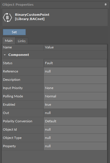 The BinaryCustomPoint component is a network point class component, which allows to read and write binary values to a defined BACnet Binary Value object and property in the remote device.