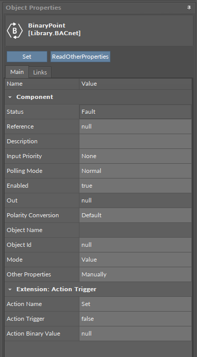 The BinaryPoint component includes an action that allows to set its Out value in case no Data Point class component is linked to it; the value is sent to the BACnet object with no priority.