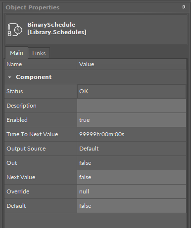 Override: allows to overrule a current logic; any value entered in the slot is sent to the Out slot regardless of the component's status, output source, or any other setting (regular weekly events, exceptional days, etc.);