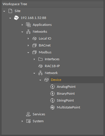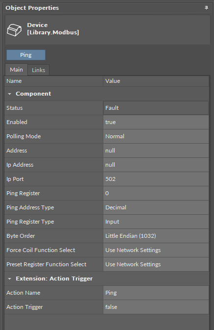 The Device component is a component to configure data for communication with a server device in the Modbus network. The RAC18-IP controller acts as a client device in the Modbus network, and the Device component allows to add remote devices connected on the Ethernet or serial port, set their unique addresses and ping registers. The ping register number defines the remote device register, which answers the master request–if there is no response from the slave device, the Device component goes into the Down status.
