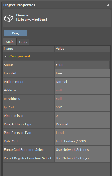 - Status: indicates the current status of the component; if the component works properly, its status is OK. The component becomes Disabled, once the Enabled slot is in false. The component's status is Fault, once the Address slot is null. If there is no response from the addressed device, the component goes into the Down status.