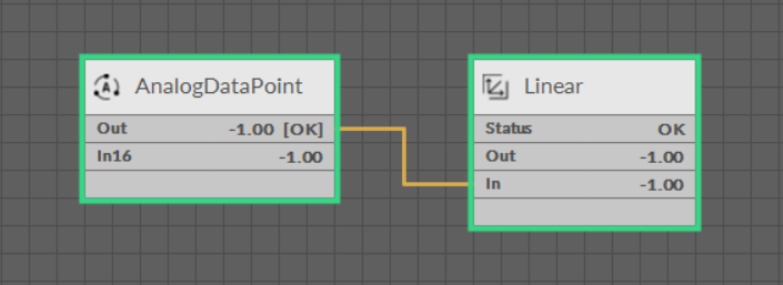 The Linear component allows to scale the Out slot value depending on the set input values interval. The In slot value is compared with x intervals, and the component estimates the Out slot value based upon the linear function. The component has a Limit slot, which allows to limit the Out slot values to the interval between minimum and maximum y values.