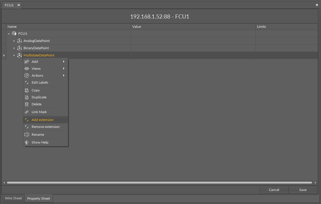 Data Points can have their functionality modified by extensions. The MultistateDataPoint is originally equipped with the BACnetMultistatePoint and ModbusMultistatePoint extensions (these cannot be added or removed), but other extensions, which offer different functionalities, can be added or removed as necessary. Extensions are added by right-clicking the MultistateDataPoint, either in the Wire Sheet or Property Sheet view, Application Manager, or in the Workspace Tree.