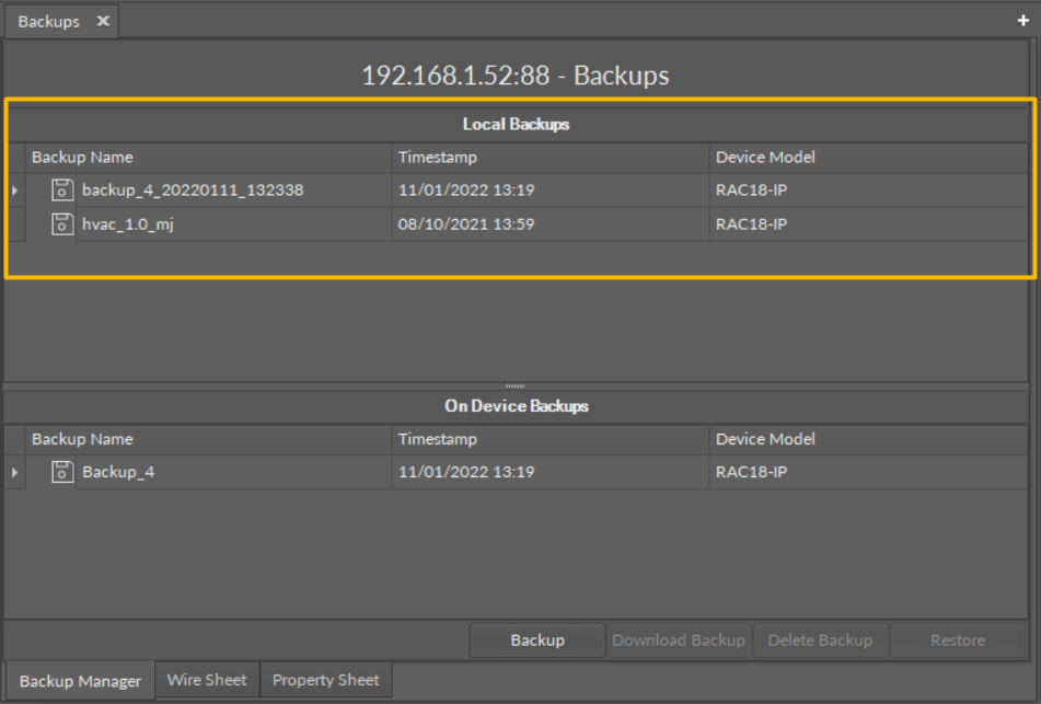 - Download Backup: downloads a backup to the PC and saves it under a selected name in the iSMA Tool’s default backup folder (home\backup\nano EDGE ENGINE); after downloading, the backup is displayed in the Local Backups section;