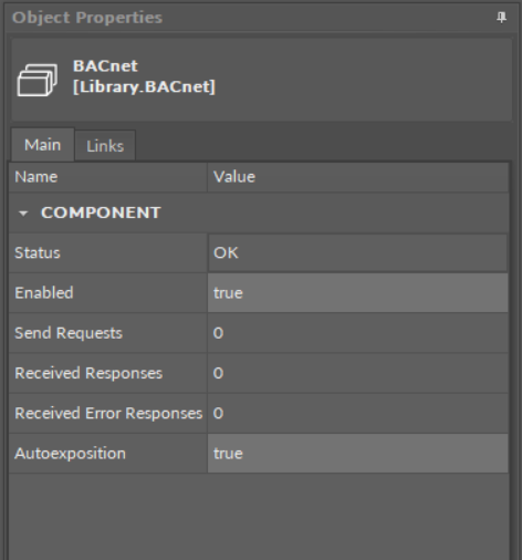 The BACnet component can be either enabled, or disabled, using the Enabled slot that manually starts or stops the whole BACnet component. Stopping it makes the device and its BACnet objects invisible in the BACnet network.