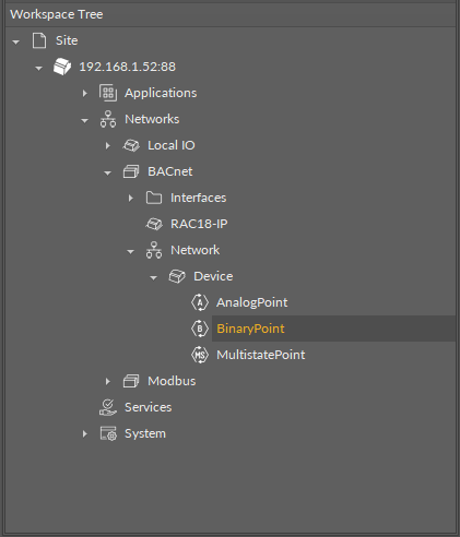The BinaryPoint component is a network point class component, which allows to read and write binary values to a defined BACnet Binary Value object in the remote device.
