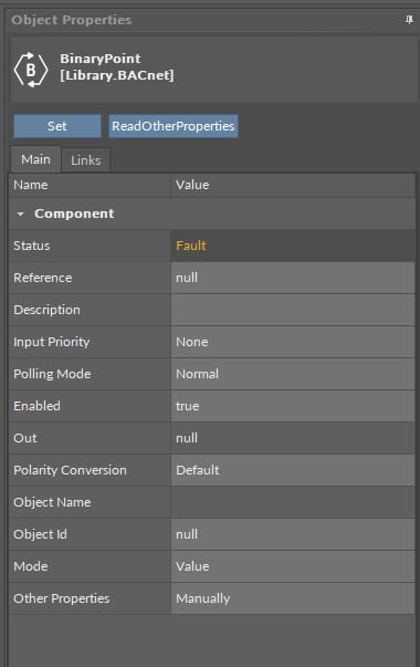 The BinaryPoint component includes an action that allows to set its Out value in case no Data Point class component is linked to it; the value is sent to the BACnet object with no priority.