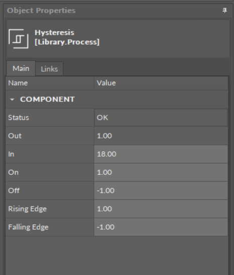 The Hysteresis component allows to set on and off trip points to an input value. Rising and Falling Edge slots define limit values for transferring On or Off value to the Out slot. The In slot receives analog values.