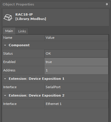 The Gateway extension enables Modbus conversion between Modbus RTU and Modbus TCP/IP protocols. It allows Modbus RTU server devices (for example, RS485 I/O modules) to communicate with the Modbus TCP/IP network through a gateway device (for example, a RAC18-IP). Using the Gateway extension does not impact the functioning of any ports selected for a gateway communication. It is possible to add more than one extension to the LocalDevice component, but it is not possible to use one port to communicate in two extensions.