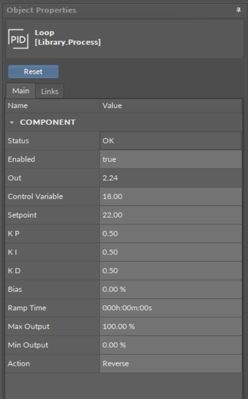 - Enabled: enables execution of the PID loop–if disabled, the Out slot is set to 0; if enabled, the component calculates the Out slot according to its regulation algorithm;