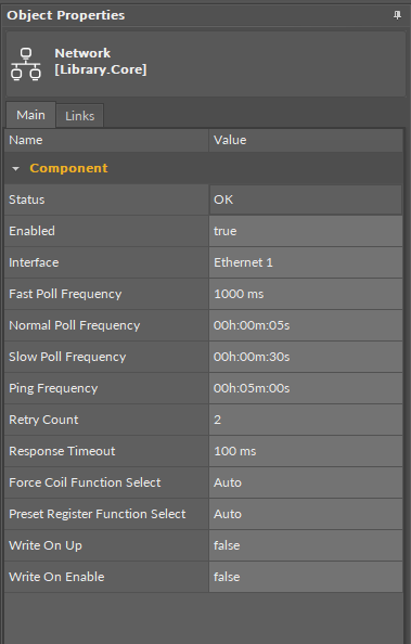 The Network component allows to configure the BACnet (IP or MS/TP) or Modbus (TCP/IP or RTU) client network. It allows to add remote devices (using the Device component) and configure basic polling schedule for such devices and their points.