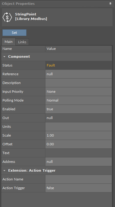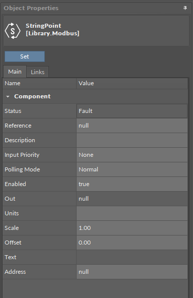 - Status: indicates the current status of the component; if the component works properly, its status is OK. The component becomes Disabled, once the Enabled slot is in false. The component's status is Fault, once the Address slot is null. If there is no response from the addressed point, the component goes into the Down status.