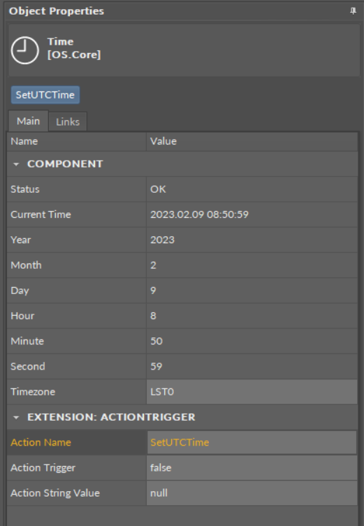 The Time component sets time and date in the device. In case the device is not powered longer than for a week, the time in the device is reset. The Time component allows to manually set local time in the device (with an action button) according to the computer's local time.