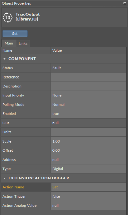The TriacOutput component includes an action that allows to set its Out value in case no Data Point class component is linked to it.