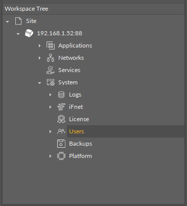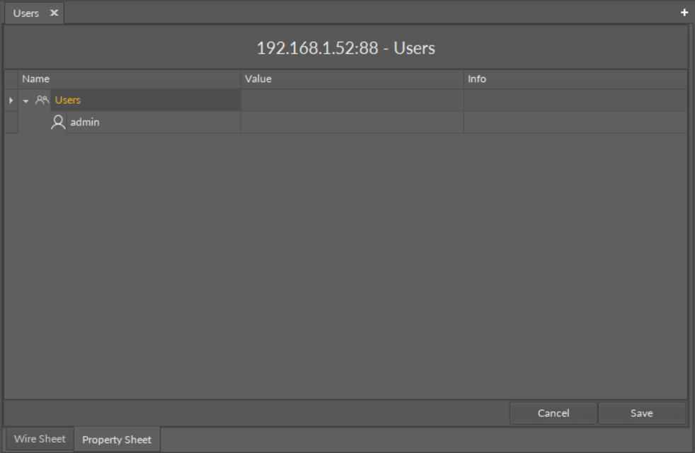 The Users component lists the users available in the device. In the first iteration, the list contains an admin user with full permissions, and there is no option to add other users. The Users component allows to change the user's password.
