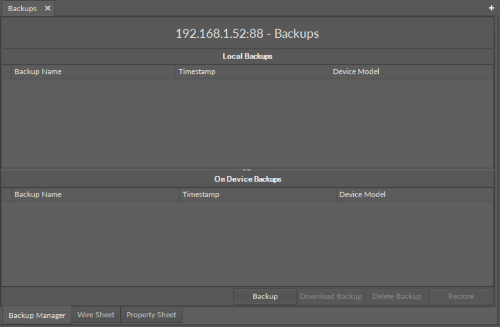 The Backups component has no configurable slots. It is operated in the Backup Manager view: