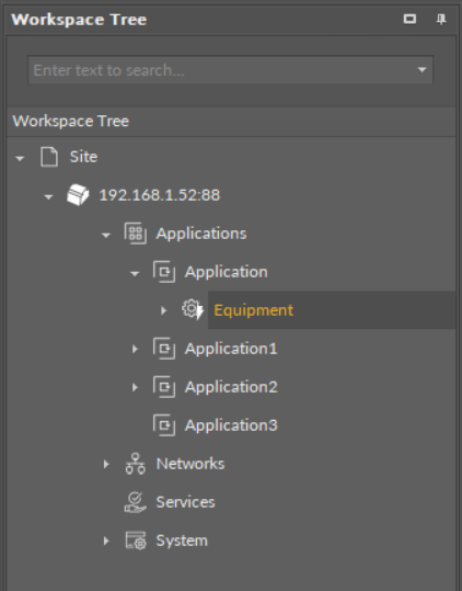 The Equipment component is a grouping folder-type component, which can be used to gather other components, regarding specific equipment included in the Application, to help organize the Workspace Tree. The Equipment can be added to the device structure, however, it cannot be added directly to the container. The Equipment component can be freely renamed to facilitate categorization of components included within.