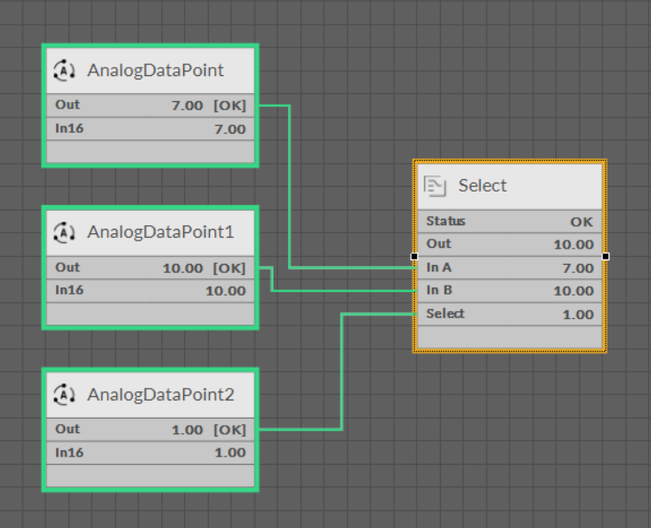 - Select: indicates the number of input, which passes the value to the Out slot.