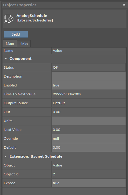 The BACnet Schedule extension expands the schedule's functionality by exposing it to the BACnet IP network as an Analog Value object, and, otherwise, it allows to manually hide it from the network yet preserving its function in the application. The extension is automatically added to the component, and is visible along with the regular slots and actions of the AnalogSchedule as a separate, integral part in the Object Properties view.