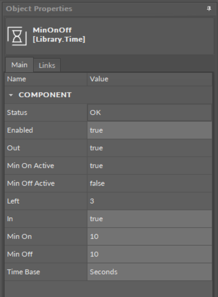 The MinOnOff component holds the value in the Out slot for the specified time. The value in the Time Base slot indicates the time unit for how long the Out slot value will be held; the holding time is specified in the Min On slot for rising edges and Min Off slot for falling edges. Once a new value is received on the In slot, it is passed to the Out slot, and (supposing it is rising edge) it is held in the Out slot for the specified time. In case the In slot receives falling edge before the specified time passes, the Out value is not changed until this time ends—only then the Out value is changed to false. This mechanism allows to protect devices, which are sensitive to frequent value changes (for example, compressors).