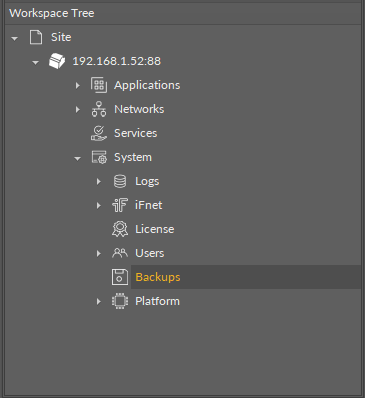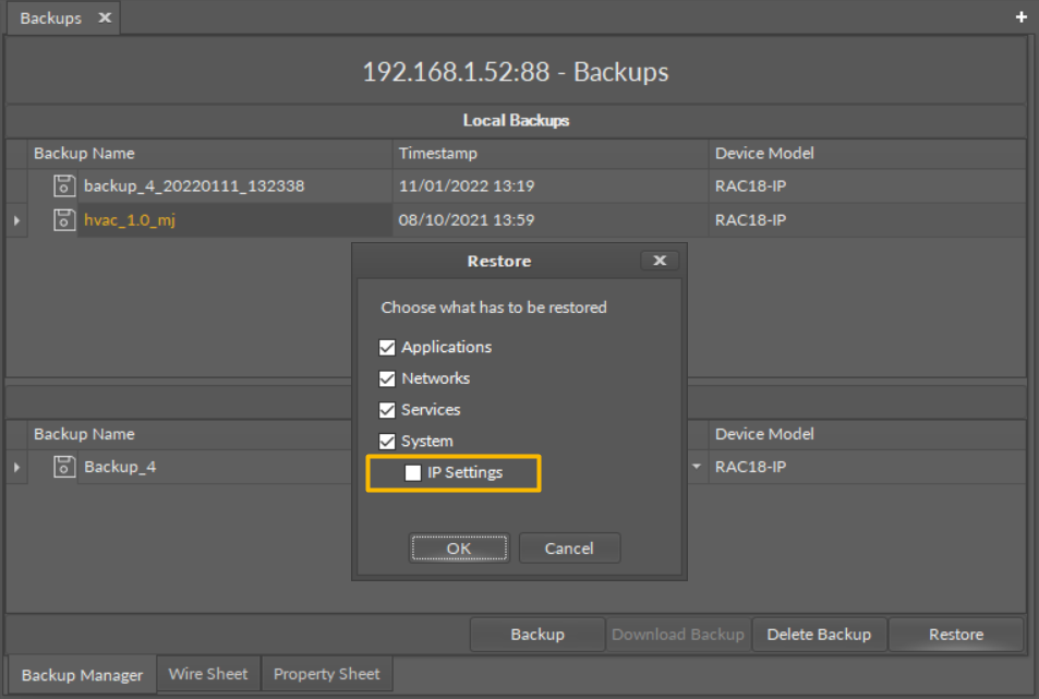 While restoring a backup, it is possible to selected whether the IP address is restored from the backup too, or lest as set on the device. By default, the option to restore IP address from a backup is unchecked.